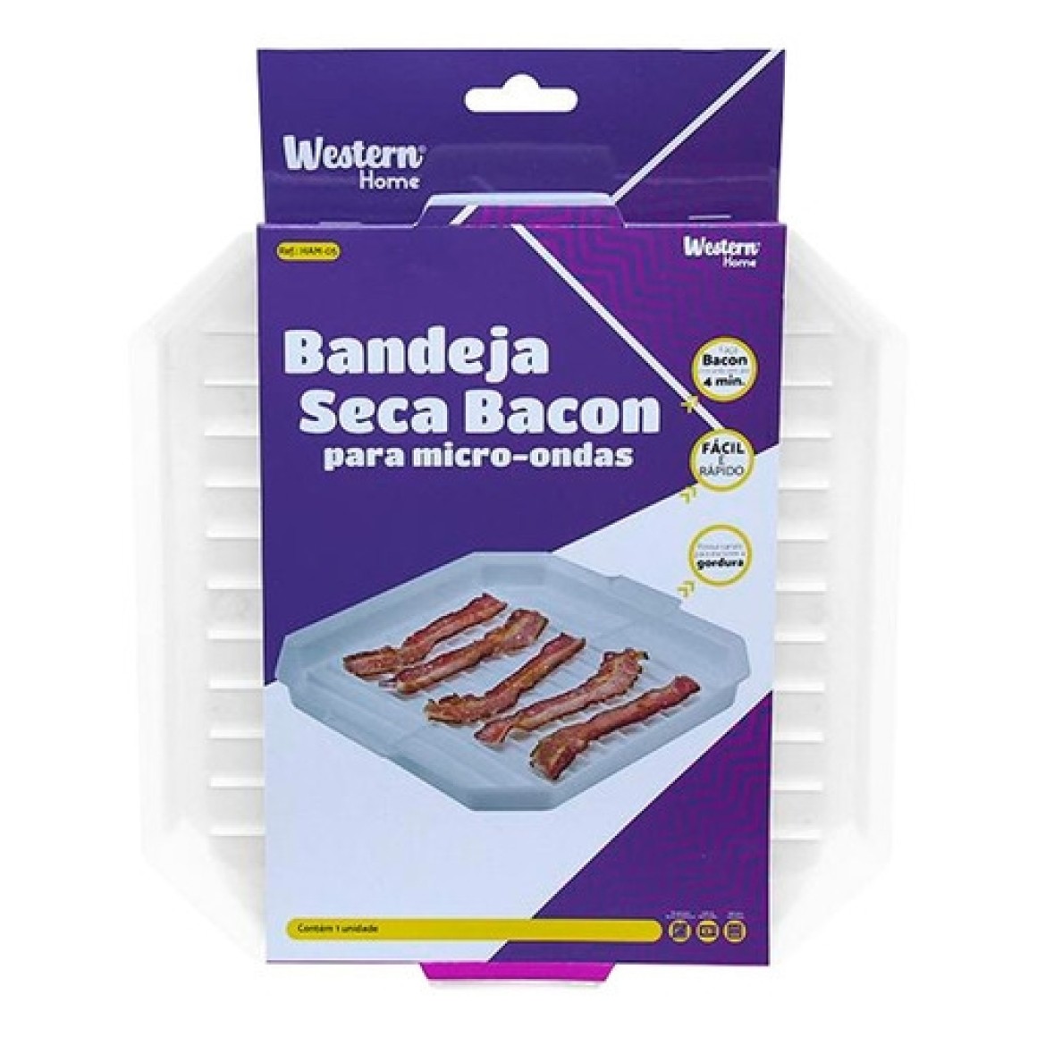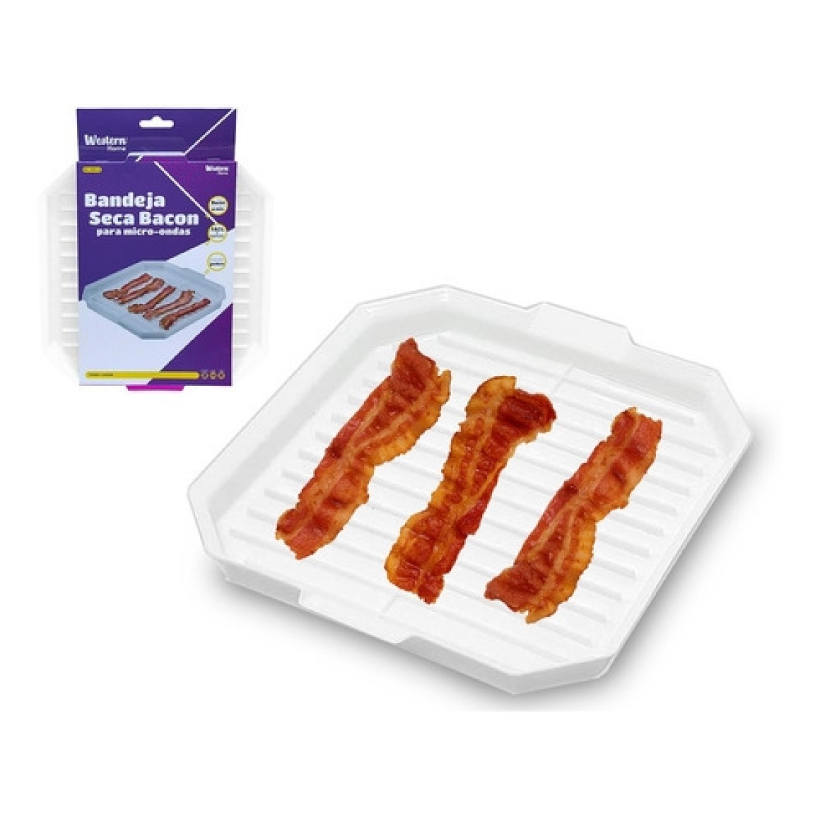 A bandeja seca bacon para micro-ondas é a maneira ideal de cozinhar bacon, pois o design simples melhora o sabor e reduz a gordura absorvida, afastando a carne da gordura que se acumula na parede da bandeja, deixando o bacon perfeitamente cozido sem a necessidade de virar.